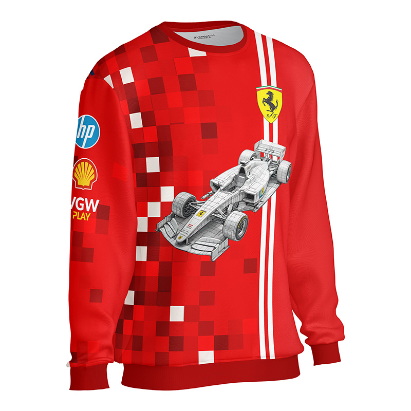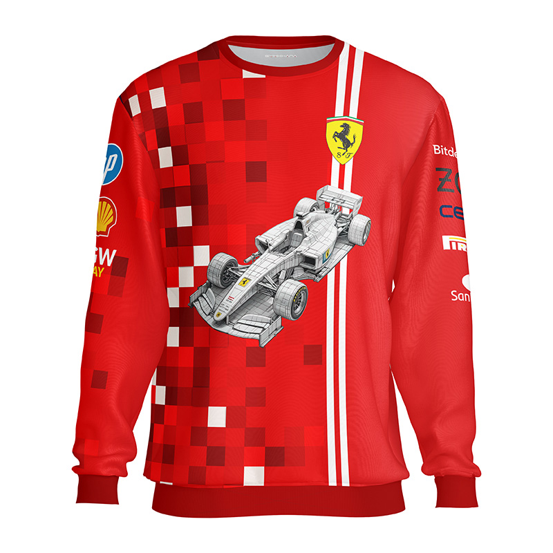 • The Front: Features a stunning schematic of a modern Formula 1 car, showcasing its complex engineering. The iconic Scuderia Ferrari shield sits proudly on the chest, flanked by authentic sponsor logos and a dynamic, pixelated red background.