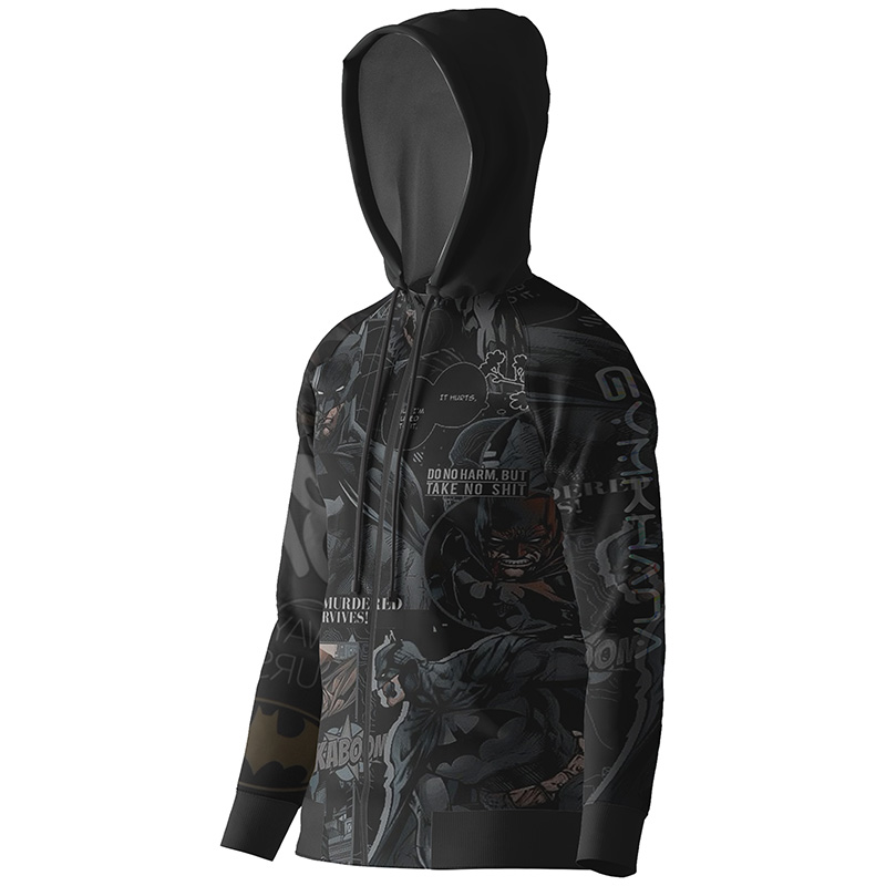 A Collage of Justice The design is a masterpiece for any true fan. The entire jacket is a canvas of black and white comic book panels, capturing the dark, detective-noir feel of Gotham City. From classic logos and powerful quotes to snippets of Batman’s origin, every detail is a tribute. The high-quality sublimation print ensures this gritty, intricate artwork is permanently infused into the fabric and will never fade.