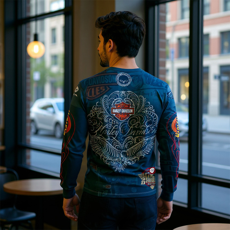 A Canvas of Chrome and Steel The design is a gritty, detailed collage of pure biker culture. The front features the iconic skull and “The Baddest of Them All” banner, a nod to Harley’s unapologetic attitude. The back showcases a masterful, filigree-style design of the H-D eagle, while the sleeves are adorned with classic logos and pinstripe flames. The entire piece is wrapped in a rugged, textured background of engine parts and vintage script, with a fade-proof sublimation print that ensures the artwork stays as tough as the brand it represents.
