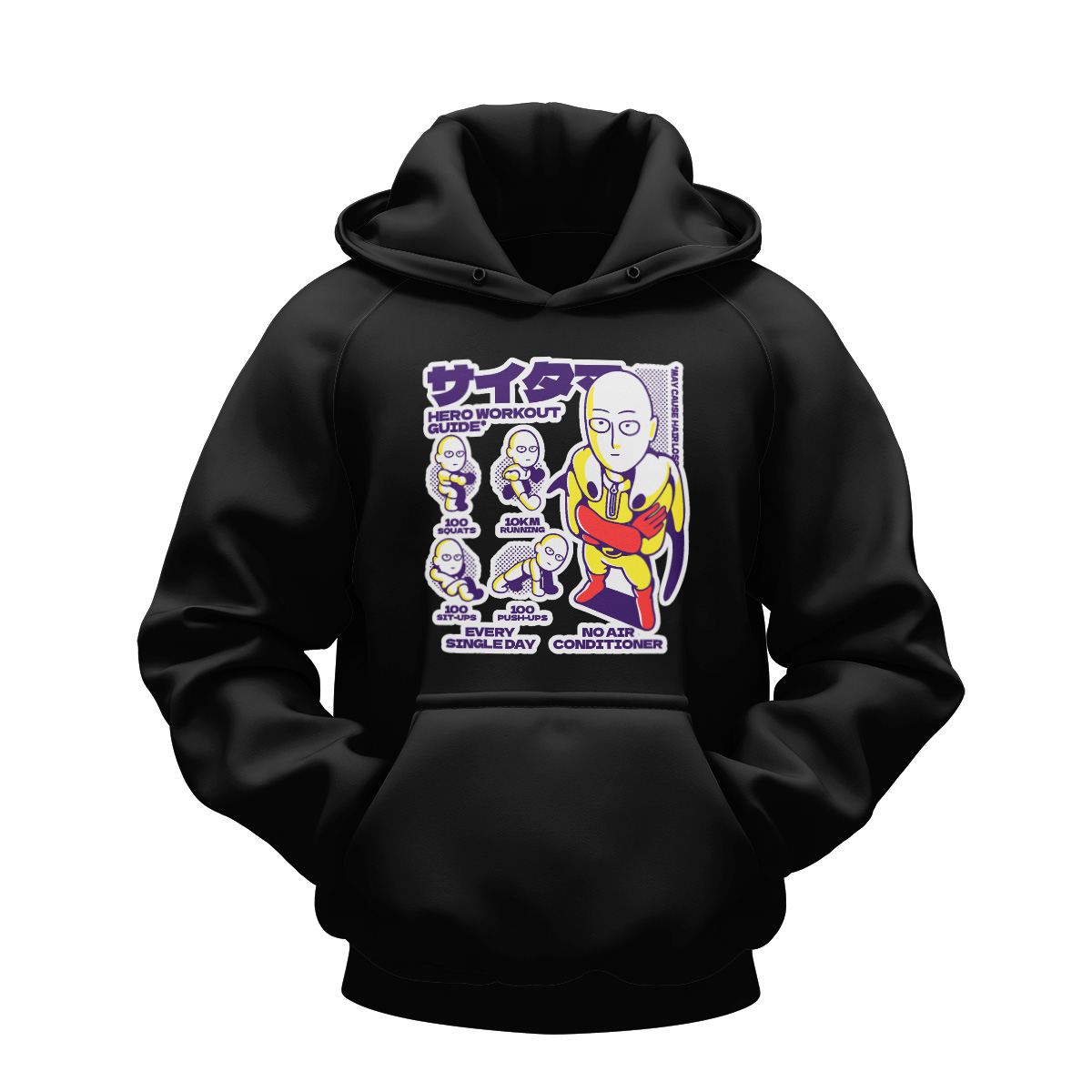 What is Saitama’s workout? Saitama’s workout includes 100 Pushups, 100 Sit Ups, 100 Squats and a 10KM (6.2 Mile) Run everyday. How effective is Saitama’s workout? If you are looking for strength, endurance, and lean body, the Saitama Workout will be fun, motivating and extremely rewarding. Dive into this workout with this matching Graphic Hoodies.