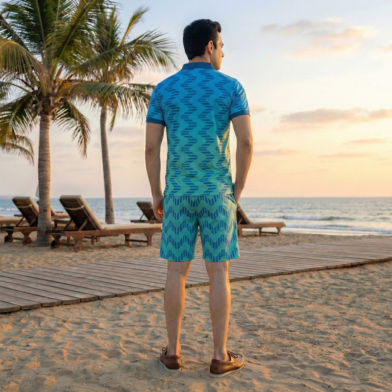 Versatility in Every Fibre The design is as smart as it is functional. The polo features a stylish blue-to-teal gradient and a functional left chest pocket, while the matching shorts are cut for a perfect athletic fit. The entire set is sublimated, meaning the vibrant pattern will never fade, crack, or peel. Ideal for the gym, jogging, or premium leisurewear, this set is your all-season answer to active style.