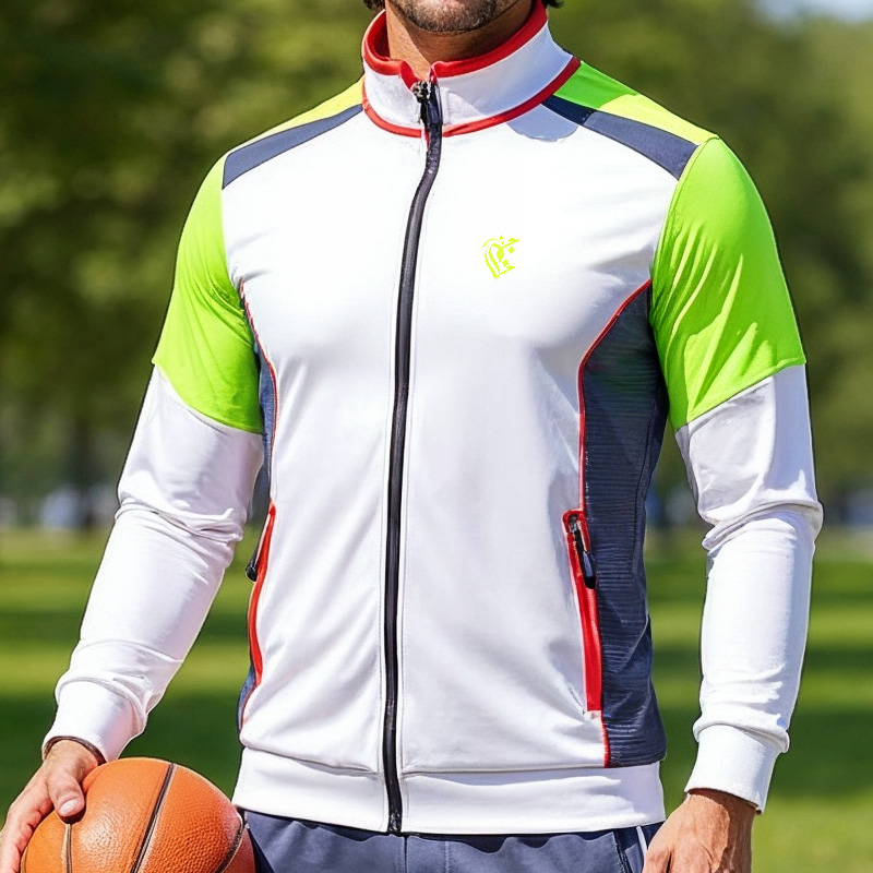 Crafted from premium, lightweight Trinda fabric, this jacket is perfect for all-season wear. The dynamic color-block design features a clean white body, charcoal grey panels, and an electric neon-lime green across the shoulders. Finished with a sporty stand-up collar (with red lining) and a secure zip pocket, this jacket is built for performance and style.