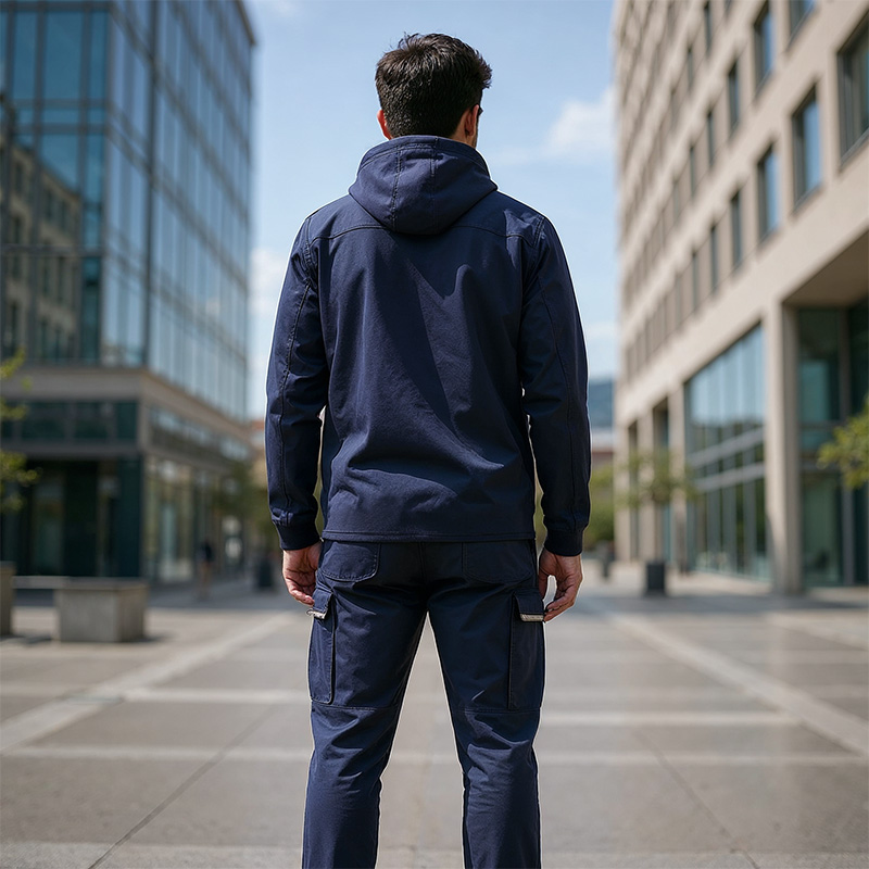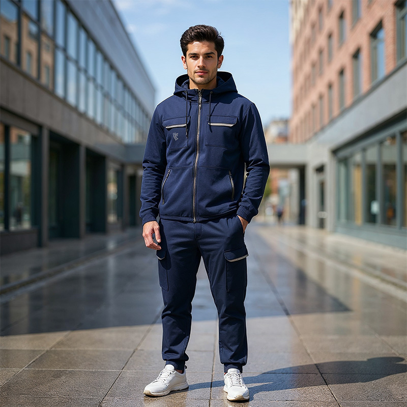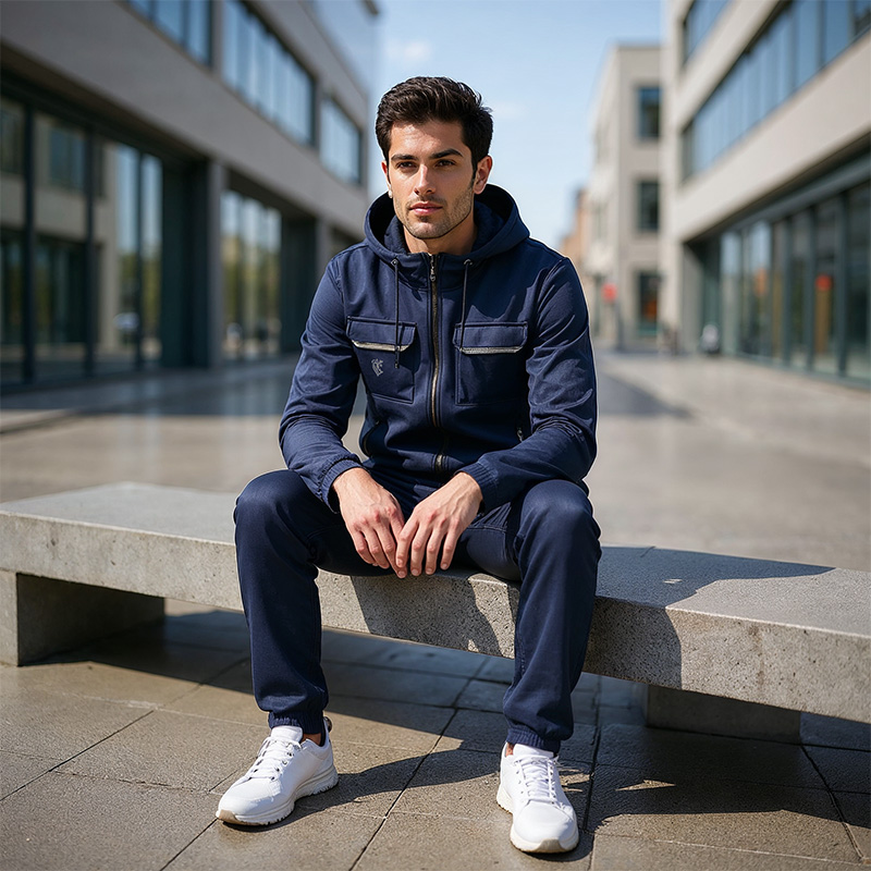 This cut & sew jogging suit is a premium product, built to last. Its unique technical fabric feels smooth and structured, providing warmth without the bulk of traditional fleece. The 4-way stretch interlock knit moves with you, making it ideal for any sports-related or leisure activity. Featuring a modern hooded design, secure zipped pockets, and functional cargo pockets, the Neo-Flex combines high-end aesthetics with practical utility.