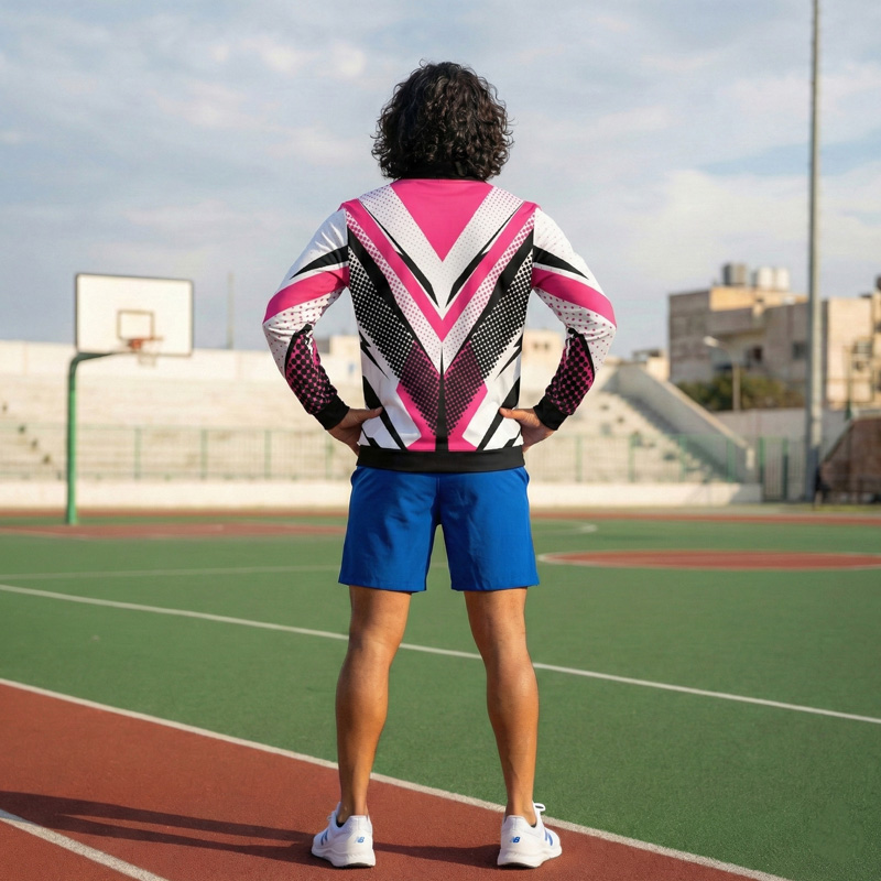 Fuel your need for speed and style with the Nitro Sports Jacket. This adrenaline-pumping design features a crisp white base charged with aggressive pink and black geometric shards. The look is amplified by dynamic halftone dot patterns and sharp angular lines that create a sense of rapid motion. Finished with a bold black collar, cuffs, and hem, this jacket is built for those who live life in the fast lane.