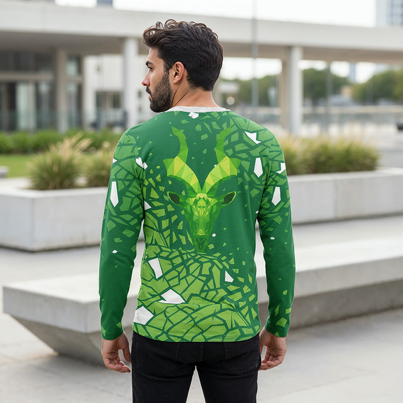 A Canvas of National Pride The design is a masterpiece of modern patriotism. The front proudly displays “Pakistan,” with the crescent, star, and national monuments artistically integrated into the lettering. The back features a powerful, low-poly illustration of the magnificent Markhor, our national animal. The entire shirt is set against a dynamic “emerald shard” pattern in shades of green, giving it a unique and energetic look. The fade-proof sublimation print ensures your pride will never fade.