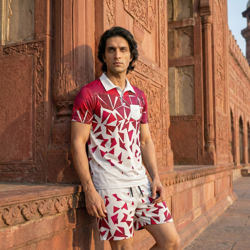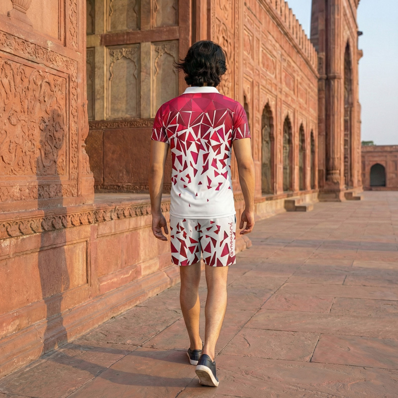 Shatter expectations with “The Rupture,” the definitive Polo and Shorts Set Pakistan for the man who makes an impact. This premium twinset, featuring a polo shirt and matching shorts, is a masterpiece of dynamic, energetic design. A “ruptured” geometric pattern in bold red explodes from the top, fading into a clean white base, engineered for those who want a high-impact look for any sport, leisure, or gym activity.