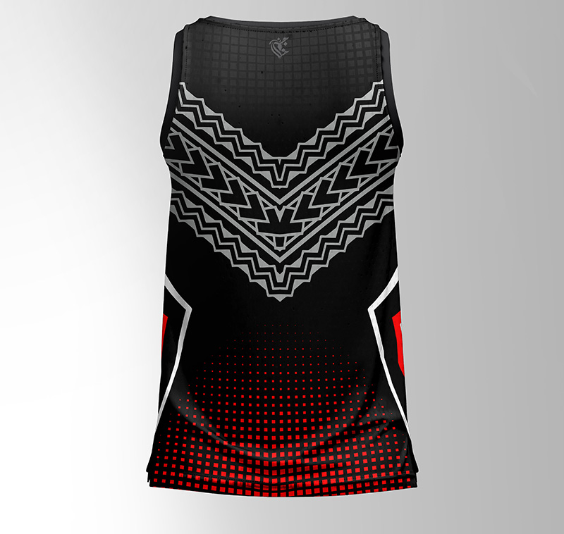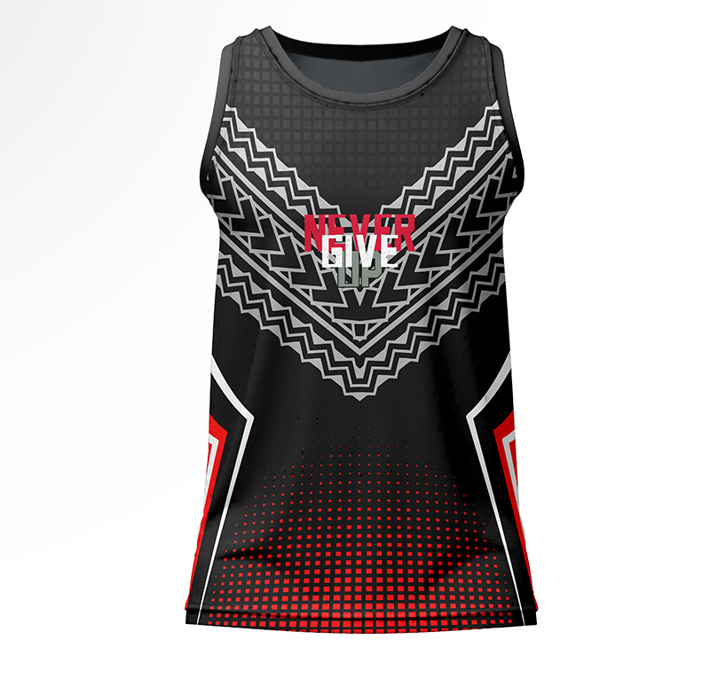 The ‘Deco’ design is a statement in itself, featuring a black base with a powerful grey tribal-deco pattern on the yoke and a sharp red halftone gradient. The “NEVER GIVE UP” graphic on the chest is your motivation. This all-over print is applied using advanced sublimation, which fuses the ink directly into the fabric, guaranteeing it will never fade, crack, or peel.