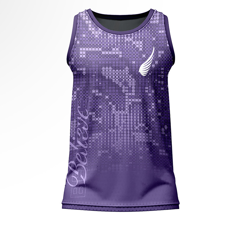 The ‘Haze’ design features a striking all-over purple mosaic/pixelated gradient. The front is detailed with a white wing graphic and “Believe” text running down the side. This intricate design is applied using advanced sublimation, which fuses the ink directly into the fabric, guaranteeing the vibrant graphics will never fade, crack, or peel.