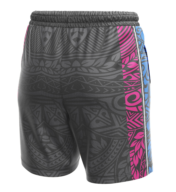 The ‘Haka’ design features a black base with a tonal grey tribal (Maori-inspired) pattern, accented with bold pink and blue tribal stripes on the sides. This intricate, all-over print is applied using advanced sublimation, guaranteeing the vibrant graphics will never fade, crack, or peel. Featuring a comfortable elastic waistband with a drawstring and functional side pockets, these shorts are the perfect blend of style and utility.