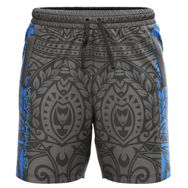 Haka all over print Sublimated Shorts for men, front view, with a black tonal tribal print and blue 'Gymkhana' logo stripe on dry-fit Lycra Mesh.